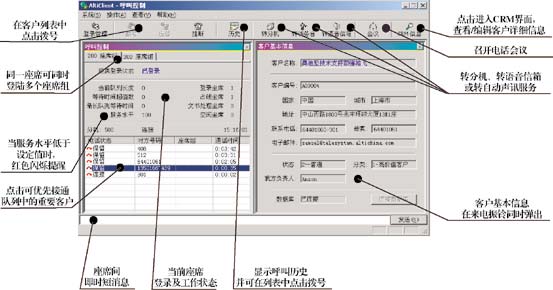 | 撥出電話:查電話號(hào)碼-〉 鍵入號(hào)碼-〉 等待 | 鼠標(biāo)雙擊客戶信息表格上的客戶名,自動(dòng)撥出、接通 |