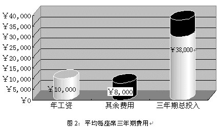 就中國目前的經(jīng)濟(jì)水平而言,一個座席人員年收入(包括工資、獎金、福利等等)大約為¥10,000,而每個座席人員所配備的軟硬件設(shè)施合計約為¥5,000;據(jù)專業(yè)機(jī)構(gòu)統(tǒng)計,中國的座席人員平均穩(wěn)定的工作年限為三年,而在這三年為了保證座席人員能夠準(zhǔn)確、高效的實現(xiàn)對用戶提供專業(yè)服務(wù),所投入的培訓(xùn)費用大約為¥3,000。所以在三年期間為每個座席的平均花費為¥38,000。