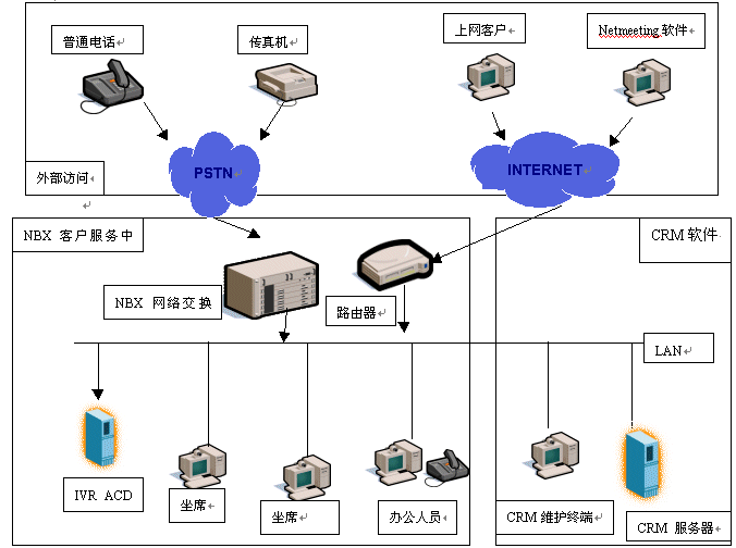 NBX呼叫中心作為與一個(gè)開放式的客戶交流平臺,為CRM系統(tǒng)和客戶之間架起了溝通的橋梁,NBX系統(tǒng)強(qiáng)大、靈活的通訊處理平臺為CRM系統(tǒng)的實(shí)施實(shí)現(xiàn)了軟著陸,使企業(yè)建立起廣泛、良好的客戶關(guān)系網(wǎng),從而逐步擴(kuò)大市場份額。