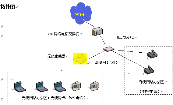 隨著信息時代的來臨,電話、電腦成了辦公領(lǐng)域的重要工具,人們在辦公室通過計算機(jī)網(wǎng)絡(luò)共享數(shù)據(jù)資源、傳遞數(shù)據(jù)信息,彼此間通過電話言語溝通。在人們享受到高科技帶來的高效率的同時,也感到一些不便,例如計算機(jī)網(wǎng)絡(luò)、電話網(wǎng)都需要單獨(dú)鋪設(shè)專用的線路,線路的變更往往是讓人心煩的事情。隨著各公司推出無線局域網(wǎng)絡(luò)解決方案(AirConnect)和NBX網(wǎng)絡(luò)電話交換機(jī)平臺的推出,通過無線局域網(wǎng)絡(luò)技術(shù),語音、數(shù)據(jù)兩網(wǎng)合一技術(shù),將電腦、電話機(jī)合二為一,同時從線路的束縛中解放出來。人們再也不用擔(dān)心布線問題,可以隨處移動辦公,享受無線網(wǎng)絡(luò)、無線話音,大大提高人們的辦公效率。