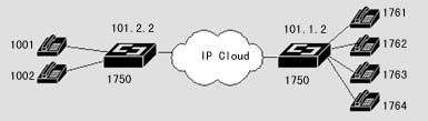 在該案例中,異地之間通過兩臺(tái)DCR 1750互連,并提供語音模塊,可直接接電話機(jī),使得異地之間可以通過IP網(wǎng)絡(luò)撥打IP語音電話。
