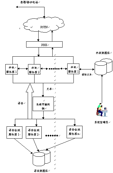 當(dāng)用戶通過電話向聲訊服務(wù)器發(fā)出請求時,聲訊服務(wù)器會首先作出分析判斷,然后從內(nèi)容數(shù)據(jù)庫中提取相應(yīng)的文本信息,經(jīng)過負載平衡機制發(fā)送給語音合成服務(wù)器。語音合成服務(wù)器在接收到文本后立刻開始合成,同時將合成好的語音發(fā)送回語音服務(wù)器,再由語音服務(wù)器回傳給用戶。其中內(nèi)容數(shù)據(jù)庫中的信息可以由系統(tǒng)管理員定期進行維護管理。(系統(tǒng)連接結(jié)構(gòu)見流程圖)