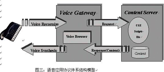 語音應(yīng)用協(xié)議(VAP VA)定義了終端--?網(wǎng)關(guān)--?服務(wù)器的體系結(jié)構(gòu)。語音服務(wù)器(Voice Server )是語音應(yīng)用的服務(wù)器,其包含語音應(yīng)用和數(shù)據(jù)、內(nèi)容;與WAP體系結(jié)構(gòu)不同的是,語音網(wǎng)關(guān)(Voice Gateway) 做為終端和語音應(yīng)用服務(wù)器的橋梁,作為語音應(yīng)用協(xié)議中的重要部分:語音瀏覽器(Voice Browser)建于語音網(wǎng)關(guān)(Voice Gateway)內(nèi),而不象WAP協(xié)議中,micro browser 建于終端中。這是因?yàn)檎Z音終端過于簡單以及語音數(shù)據(jù)可以通過電信網(wǎng)絡(luò)輕松與語音網(wǎng)關(guān)(Voice Gateway)交互。