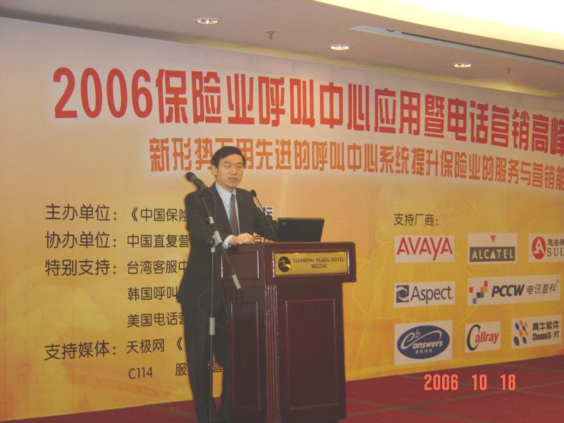 。。2006年10月18日,2006保險業(yè)呼叫中心應用暨電話營銷高峰研討會在北京天鴻科園大酒店隆重召開,以下是大會開幕致辭的相關(guān)圖片報道: