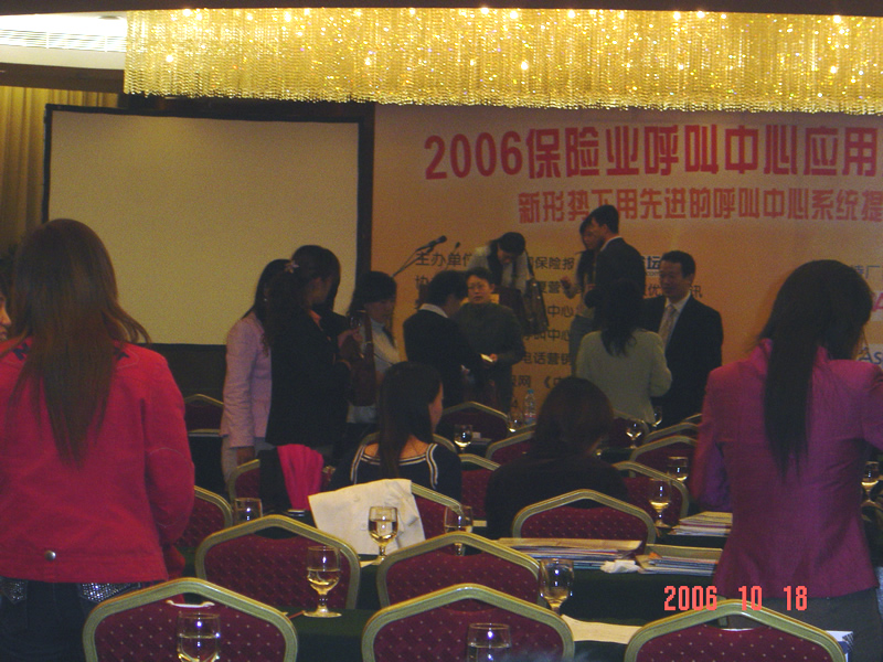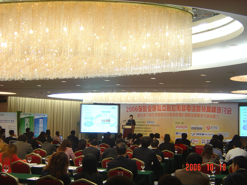。。2006年10月18日,2006保險(xiǎn)業(yè)呼叫中心應(yīng)用暨電話營銷高峰研討會在北京天鴻科園大酒店隆重召開,以下是會議現(xiàn)場的相關(guān)圖片報(bào)道: