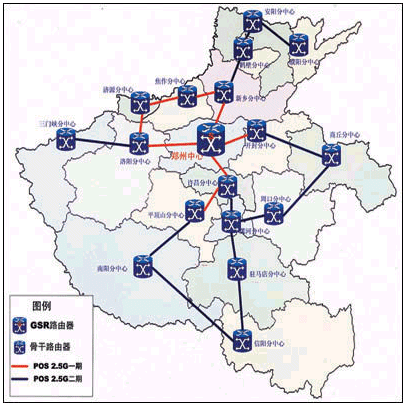 HERNET一期工程主干網(wǎng)采用IP POS技術(shù),應(yīng)用AVVID網(wǎng)絡(luò)體系結(jié)構(gòu),采用骨干傳輸網(wǎng)、城域網(wǎng)、接入網(wǎng)三層設(shè)計(jì)方案,以省網(wǎng)絡(luò)中心(設(shè)在鄭州大學(xué)網(wǎng)絡(luò)中心)、地市網(wǎng)絡(luò)中心、校園網(wǎng)三級(jí)管理模式。由省網(wǎng)絡(luò)中心向下以2.5G速度連接到各地市網(wǎng)絡(luò)中心,而向上則以155M速度連接到CERNET及Internet。整個(gè)一期工程實(shí)現(xiàn)了包括鄭州、許昌、平頂山、開(kāi)封、洛陽(yáng)、濟(jì)源、焦作以及新鄉(xiāng)等7個(gè)地市的2.5G連接,并形成了一個(gè)環(huán)網(wǎng)狀冗余拓?fù)浣Y(jié)構(gòu),確保當(dāng)網(wǎng)絡(luò)的一個(gè)節(jié)點(diǎn)出現(xiàn)問(wèn)題時(shí),數(shù)據(jù)可以通過(guò)其他途徑傳輸?shù)侥康牡,在一期工程完成后,?0多所大學(xué)、中小學(xué)等教育與科研單位以千兆速度連接到HERNET上,共有近50萬(wàn)的用戶能夠充分利用高速帶寬獲得教育網(wǎng)資源。