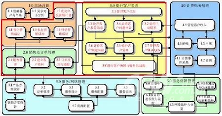 AIOpenCRM將重點(diǎn)支持客戶(hù)/市場(chǎng)層面的服務(wù)開(kāi)通、服務(wù)保障的內(nèi)容,具體包含了市場(chǎng)營(yíng)銷(xiāo)、銷(xiāo)售及訂單管理、提升客戶(hù)關(guān)系、計(jì)費(fèi)帳務(wù)處理、服務(wù)開(kāi)通管理、服務(wù)報(bào)障管理這六個(gè)高層流程的前三個(gè)。如下圖: