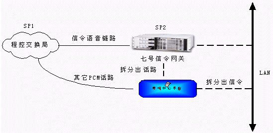 程控端局傳輸過(guò)來(lái)的信令和話路通過(guò)同一條PCM線傳輸。七號(hào)信令網(wǎng)關(guān)處理多時(shí)隙流的PCM接入,并將信令和話路分開(kāi),同時(shí)將話路轉(zhuǎn)出到呼叫中心平臺(tái)中。這種方式充分利用了物理資源,適合于信令鏈路比較簡(jiǎn)單的系統(tǒng),這種方式使結(jié)構(gòu)更顯緊湊,減少系統(tǒng)所需資源,通常用于單鏈路的結(jié)構(gòu)。
