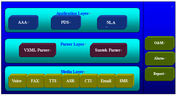 面向快速集成開發(fā),靈活開放、堅如磐石,可擴展性極強。它廣泛支持各類主流交換機和CTI中間件,提供了自動語音,傳真收發(fā),大規(guī)模會議,TTS/ASR,VXML,支持直接對外部數據操作和DLL調用等領先功能。Ssurnon-IVR已經在國內絕大多數語音增值運營商在線運行,例如,TOM.COM公司采用新太IVR系統,憑借快速的新業(yè)務開發(fā)和強大的功能,業(yè)務發(fā)展非常迅速,三個月后語音增值營業(yè)收入達到每月數百萬元。