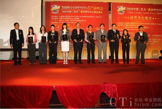 “2009中國(guó)呼叫中心產(chǎn)業(yè)峰會(huì)暨2009中國(guó)(亞太)最佳呼叫中心”頒獎(jiǎng)典禮于10月15日在北京富力萬(wàn)麗酒店舉行并取得圓滿成功。本次大會(huì)由中國(guó)電子商會(huì)呼叫中心及客戶關(guān)系管理專業(yè)委員會(huì)(CNCCA)主辦,密之云(北京)呼叫產(chǎn)業(yè)基地有限公司協(xié)辦,CTI論壇承辦。同時(shí),大會(huì)還獲得了亞太客服與呼叫中心聯(lián)盟(APCCAL)、上海市呼叫中心與無(wú)線尋呼協(xié)會(huì)和北京市通信行業(yè)協(xié)會(huì)呼叫中心專業(yè)委員會(huì)等機(jī)構(gòu)的大力支持。