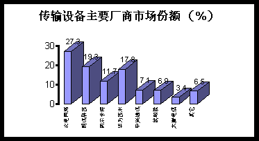 (1) 市場規(guī)模: 年內(nèi),寬帶網(wǎng)絡(luò)熱的興起極大地推動了傳輸設(shè)備市場的發(fā)展,以DWDM為代表的高端光傳輸設(shè)備已進入大規(guī)模商用階段,包括光分插復(fù)用設(shè)備(OADM)和光交叉連接設(shè)備(OXC)與現(xiàn)有傳統(tǒng)的SDH等傳輸設(shè)備市場空前繁榮,全年出貨值達到104.8億元人民幣。