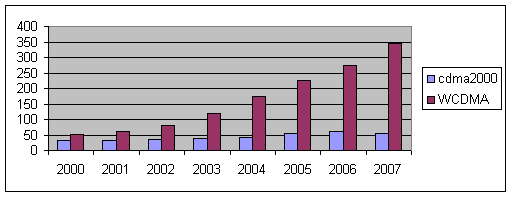 2000年,3G市場收入在cdma2000(大約31億美元,占38%)與WCDMA(大約50億美元,占62%)分布為1/3比2/3。我們不難看出,這種變化有利于WCDMA。到2007年,預(yù)計(jì)WCDMA將占全部市場收入的86%。這是由于對(duì)于WCDMA,運(yùn)營商需要增加支出來將其網(wǎng)絡(luò)升級(jí)為GPRS、EDGE與WCDMA。同時(shí),在預(yù)測期內(nèi),TDMA運(yùn)營商最終要將其所有現(xiàn)存的TDMA與模擬特性升級(jí)為GSM/GPRS。相比之下,CDMA運(yùn)營商處于良好的狀態(tài),其現(xiàn)有基礎(chǔ)設(shè)施的大部分軟件已經(jīng)升級(jí)。CDMA運(yùn)營商,如Verizon,確實(shí)也有模擬特性,但是較之GSM/TDMA而言,它們要低得多。CDMA運(yùn)營商支出的大部分將以新的Cell sites的形式出現(xiàn)的覆蓋率。