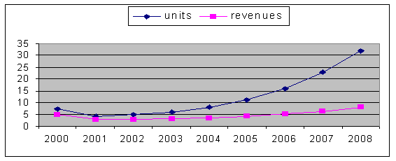 圖2、2000年至2008年全球視頻會(huì)議桌面系統(tǒng)市場:數(shù)量與收入預(yù)測
