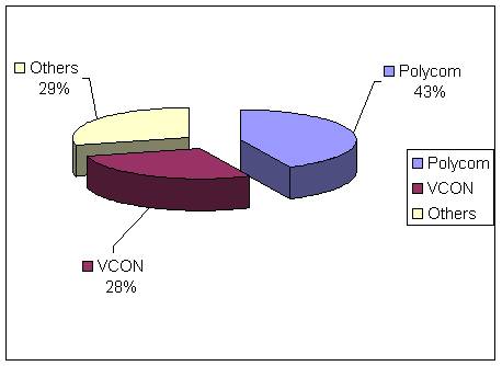 表4和圖3顯示了2001年桌面視頻會(huì)議市場競爭廠商銷售額市場份額,表2和圖2顯示了銷售量的市場份額。隨著新產(chǎn)品的和新廠商的進(jìn)入,競爭態(tài)勢將在未來不斷變化。目前該市場上兩個(gè)最大的廠商是Polycom和VCON, 其他一些小廠商市場份額較小。