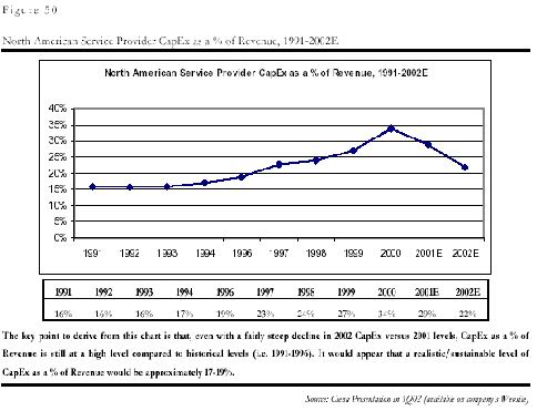 和中國的問題一樣,制造商的問題是電信服務企業(yè),即運營商的投入減少造成的。由于上世紀末互聯(lián)網(wǎng)和電子商務泡沫的虛假繁榮的影響,各運營商都嚴重高估了市場需求,認為需求是會隨著通信能力的增強無限增加,因此市場規(guī)模是會無限擴張的,他們在缺乏對最終用戶需求的深入分析的前提下,普遍在基礎設施的建設上進行了超大規(guī)模的投入,其基礎設施建設投入在收入中的比例一度在2000年從平均的15%達到了創(chuàng)記錄的35%!