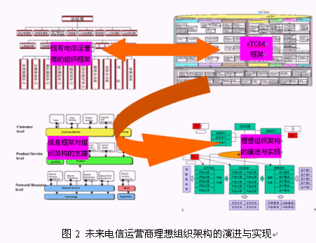 現(xiàn)有的電信運(yùn)營(yíng)商的管理架構(gòu)向理想的管理組織架構(gòu)演進(jìn)過(guò)程中,要涉及到不同的中間過(guò)程和步驟,對(duì)中間過(guò)渡狀態(tài)的評(píng)估和有效實(shí)現(xiàn),是實(shí)現(xiàn)演進(jìn)的關(guān)鍵。現(xiàn)有組織架構(gòu)管理職能的對(duì)應(yīng),業(yè)務(wù)流程的標(biāo)準(zhǔn)化,管理流程的標(biāo)準(zhǔn)化,企業(yè)IT支撐架構(gòu)對(duì)業(yè)務(wù)職能部門(mén)的支撐,這些環(huán)節(jié)都是運(yùn)營(yíng)商應(yīng)該重點(diǎn)考慮的中間內(nèi)容。圖2顯示了未來(lái)電信運(yùn)營(yíng)商理想組織架構(gòu)的演進(jìn)與實(shí)現(xiàn)過(guò)程。其中的任何一個(gè)環(huán)節(jié)都是電信運(yùn)營(yíng)管理研究的核心課題,也直接影響到了電信運(yùn)營(yíng)管理變革的成敗。