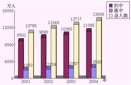 2001年,中國大陸中學(xué)學(xué)生人數(shù)已達(dá)10765萬人,而且學(xué)生人數(shù)還在快速增長。初中學(xué)生人數(shù)以每年6.5%的速度增長,普通高中學(xué)生人數(shù)也以每年10%-11%的速度增長?梢钥闯,教育市場(chǎng)巨大的潛力和商機(jī)。