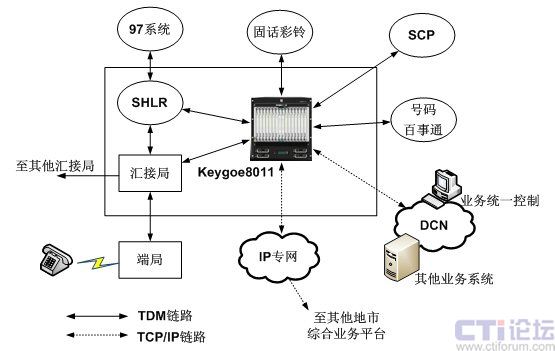 東進Keygoe系列多媒體交換機通過高密度7號信令鏈路支持、大容量的時隙交換、多網(wǎng)絡接口和語音處理完成不同業(yè)務系統(tǒng)的7號信令的接續(xù)和解析、話音交換和協(xié)議轉換。對于已經(jīng)進行固網(wǎng)智能改造的電信網(wǎng)絡,可以在匯接局將各種業(yè)務平臺連接至東進Keygoe系列多媒體交換機,并通過東進Keygoe系列多媒體交換機連接至SHLR,實現(xiàn)多業(yè)務平臺上的多業(yè)務觸發(fā),同時通過SHLR與97系統(tǒng)以及其他業(yè)務支撐系統(tǒng)連接起來,實現(xiàn)業(yè)務的統(tǒng)一批價、鑒權和計費;對于沒有進行固網(wǎng)智能化改造的電信網(wǎng)絡,可以在匯接局通過東進Keygoe系列多媒體交換機和SSP提供基于TCP/IP層面的業(yè)務平臺互聯(lián)。