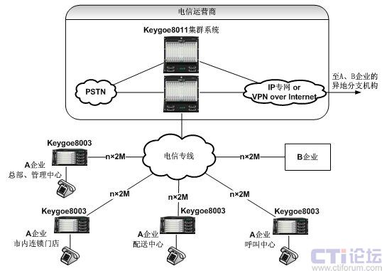 利用東進Keygoe系列多媒體交換機的多網(wǎng)絡融合性能通過電信優(yōu)質(zhì)的IP專網(wǎng)將位于不同省市的通信外包大平臺連接起來,實現(xiàn)異地平臺的IP互聯(lián),建立跨區(qū)域的分布式的統(tǒng)一大平臺,為連鎖企業(yè)提供全國和全省統(tǒng)一電話號碼和其他的跨地區(qū)應用提供了基礎。