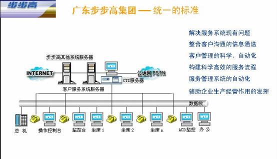 步步高呼叫中心最有效益的應(yīng)用就是在客戶服務(wù)管理系統(tǒng)中發(fā)揮前端強(qiáng)有力的支持作用,它不但給客戶提供高級的交互式服務(wù),而且為業(yè)界確定了新的客戶服務(wù)滿意標(biāo)準(zhǔn)。