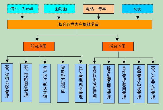 后臺客服應(yīng)用子系統(tǒng)能夠很方便地與前臺呼叫中心整合,以更全面的功能,提供一流的客戶服務(wù)。整個后臺系統(tǒng)包括一系列完善的功能:客戶咨詢/投訴管理、客戶預(yù)約服務(wù)受理、客戶回訪/電話營銷、智能檢索知識庫、日歷管理/視圖管理、服務(wù)權(quán)限/流程控制、服務(wù)監(jiān)管/商場管理、備件管理/費(fèi)用管理、派單管理/單據(jù)管理、客戶/產(chǎn)品分析管理。