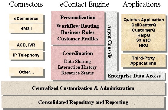 Quintus最新推出的Quintus eContact Suit 5.6是一套完整全面的CRM解決方案,包括交互層次的CRM——客戶接觸中心,運(yùn)營層次的CRM——Quintus CRM應(yīng)用(如CallCenterQ、SalesQ等)和分析層次的CRM——Quintus報(bào)表分析系統(tǒng)