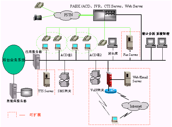 · 一個(gè)完整的呼叫中心解決方案通常由以下核心部分組成:自動(dòng)呼叫分配(ACD)、交互式語(yǔ)音應(yīng)答(IVR)、計(jì)算機(jī)電話綜合應(yīng)用(CTI)、錄音服務(wù)器、呼叫管理(CMS)等。