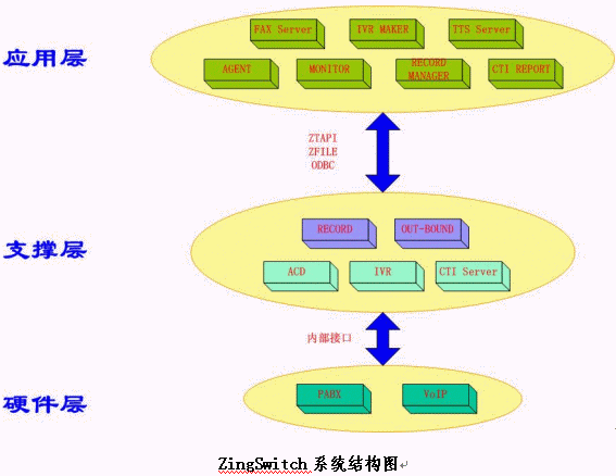 在以上三層結(jié)構(gòu)中,前兩層與具體業(yè)務(wù)系統(tǒng)無關(guān)。上層業(yè)務(wù)系統(tǒng)的多種變化,不會影響下層的穩(wěn)定;而下層規(guī)范地進行優(yōu)化和擴展后,上層的所有應(yīng)用都可在業(yè)務(wù)功能上得到擴展。這樣,用戶的業(yè)務(wù)應(yīng)用系統(tǒng)自身可以有多種功能和性能的變動和擴展,同時,當(dāng)基于ZingSwitch一體化交換機的呼叫中心系統(tǒng)平臺在進行擴容、升級的時候,原來已經(jīng)無縫掛接其上的用戶的業(yè)務(wù)應(yīng)用系統(tǒng)也無需任何更改即可運行。