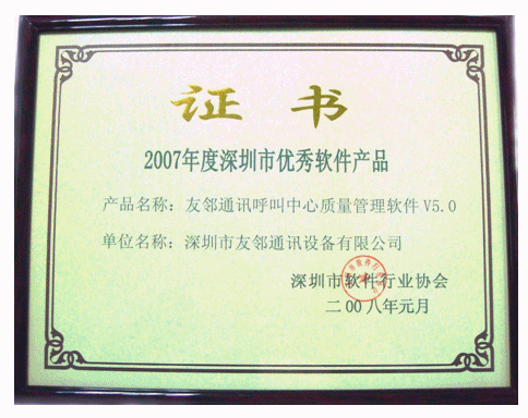 2008年3月14日,深圳市友鄰?fù)ㄓ嵲O(shè)備有限公司(以下簡稱“友鄰?fù)ㄓ崱保┬,公司主打軟件產(chǎn)品“友鄰?fù)ㄓ嵑艚兄行馁|(zhì)量管理軟件V5.0”(即 AP Suite 呼叫中心質(zhì)量管理系統(tǒng)V5.0)榮獲深圳市軟件行業(yè)協(xié)會“2007年度深圳市優(yōu)秀軟件產(chǎn)品”榮譽稱號。