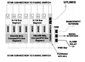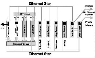 如果我們采用基于CompactPCI標(biāo)準(zhǔn)的刀片服務(wù)器系統(tǒng)來實(shí)現(xiàn),系統(tǒng)可能就是完全另外一種樣子(如圖1),這樣的實(shí)現(xiàn),首先系統(tǒng)體積小,只要一個(gè)刀片服務(wù)器機(jī)箱;第二,系統(tǒng)基于標(biāo)準(zhǔn)的體系架構(gòu),開發(fā)和維護(hù)容易,成本低廉;第三,系統(tǒng)非常好地集成了語音通信和IP通信,易于部署增值電信業(yè)務(wù);第四,系統(tǒng)具有較好的可擴(kuò)展性,因?yàn)楸嘲逄峁┝素S富的帶寬資源,同時(shí)單位空間內(nèi)豐富的插槽,可以安裝更多的服務(wù)器刀片,提供了充足的計(jì)算資源;第五,系統(tǒng)還可以利用各種高可靠性和高可管理性的特點(diǎn)。