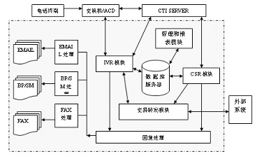 客戶服務(wù)中心系統(tǒng)由智能排隊(duì)機(jī)(含接入服務(wù)器)、核心服務(wù)器CTI、交互式語音應(yīng)答系統(tǒng)IVR、語音傳真服務(wù)器、業(yè)務(wù)服務(wù)器、工作流服務(wù)器、數(shù)據(jù)庫(kù)服務(wù)器、Internet/Intranet服務(wù)器、人工座席、尋呼機(jī)接口、手機(jī)短消息接口等組成。