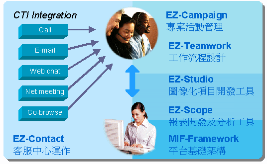 EZactor客服中心CRM平臺(tái)系統(tǒng),以MIF-Framework模塊為平臺(tái)基礎(chǔ)架構(gòu),在該強(qiáng)大之穩(wěn)定架構(gòu)上以EZ-Contact模塊作為客服中心運(yùn)作核心,另外延伸有EZ-Campaign、EZ-Teamwork、EZ-Scope、EZ-Studio等模塊,分別提供營(yíng)銷(xiāo)活動(dòng)管理、工作流程設(shè)計(jì)、數(shù)據(jù)統(tǒng)計(jì)與分析、項(xiàng)目開(kāi)發(fā)工具等功能,全面滿(mǎn)足客服中心運(yùn)行之需要。