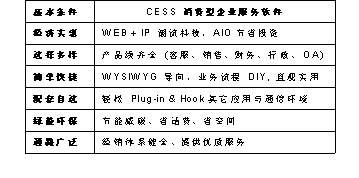 CESS消費型服務(wù)軟件具有經(jīng)濟(jì)實惠、選擇多樣、簡單快捷、配套自選、綠能環(huán)通路廣泛等特點,采用Web+IP的潮流科技,AIO節(jié)省投資,使軟件經(jīng)濟(jì)實惠;CESS軟件產(chǎn)品線齊全,涵蓋客服、銷售、財務(wù)、行政、OA等很多方面,給您多樣選擇;WYSIWYG(所見即所得)導(dǎo)向,業(yè)務(wù)流程DIY,讓您至需要動動鼠標(biāo)就可以DIY您想要得到的設(shè)計,不再需要麻煩IT人員,只管實用,簡單快捷;輕松Plug-in & Hook其它應(yīng)用與通信環(huán)境,可根據(jù)您的需要配套自選;節(jié)能減碳、省話費、省空間,綠色環(huán)保;經(jīng)銷體系健全、提供優(yōu)質(zhì)服務(wù),通路廣泛。