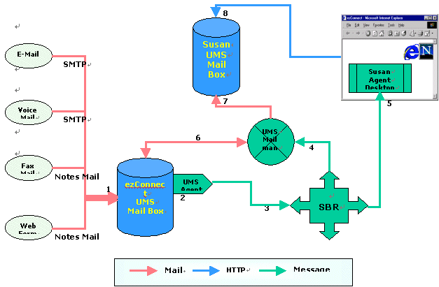 各類外部語音、郵件、WEB、傳真等信息進(jìn)入呼叫中心會以相應(yīng)的格式直接被放入ezConnect統(tǒng)一郵件服務(wù)器(1),消息經(jīng)過UMS Agent 模塊被提取出信息主題和關(guān)鍵字(2),這些主題和關(guān)鍵字被送入基于技能的路由選擇模塊SBR(3),由SBR進(jìn)行分析,選擇出最合適服務(wù)的座席(例如是Susan);之后SBR通知郵件轉(zhuǎn)發(fā)器(4)去ezConnect統(tǒng)一郵件服務(wù)器中取相應(yīng)的郵件(6),將郵件放入最佳座席(Susan)的UMS信箱中(7)(8),與此同時座席Susan的界面上顯示出她有一封新的郵件(5)。至此,完成了座席Susan 接收UMS信件的全過程。