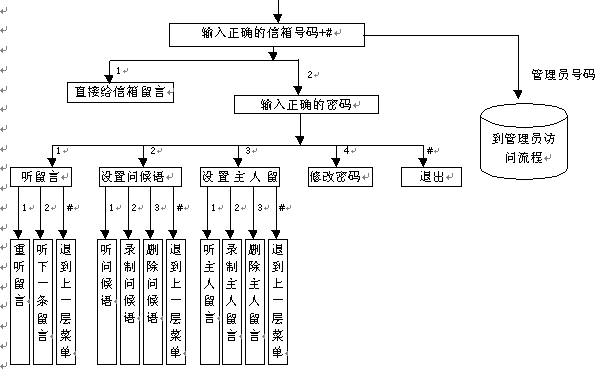 作為信箱主人的用戶既可以象其它普通用戶一樣進(jìn)行普通用戶訪問(wèn)(指訪問(wèn)其它分機(jī)、給其它分機(jī)主人留言等),還可以使用系統(tǒng)專門提供的主人訪問(wèn)服務(wù)功能。