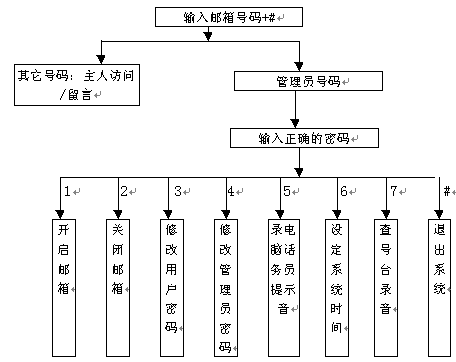 3). 管理員可完成的功能有:①開(kāi)啟信箱,②關(guān)閉信箱,③修改用戶密碼,④修改管理員密碼,⑤錄制電腦話務(wù)員提示語(yǔ),⑥設(shè)定系統(tǒng)時(shí)間,⑦查號(hào)臺(tái)錄音
