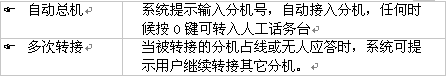 若您要的分機(jī)正在忙或分機(jī)主人不在電話機(jī)旁,可直接轉(zhuǎn)到留言信箱,止項(xiàng)功能要求在交換機(jī)數(shù)據(jù)庫(kù)中設(shè)置分機(jī)遇忙/無(wú)應(yīng)答轉(zhuǎn)移到留言信箱。