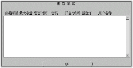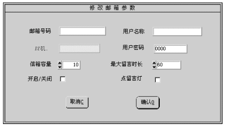 1). 您可修改的參數(shù)有:用戶名稱、用戶密碼、信箱容量、最大留時(shí)長(zhǎng)、開(kāi)啟/關(guān)閉、點(diǎn)留言燈。有關(guān)參數(shù)的細(xì)節(jié)將在增加信箱一節(jié)中介紹。