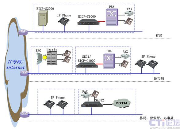 在省局我們采用EICP-S2000或EICP-C1000作為整個系統(tǒng)的核心服務器/控制器,并可與原有PBX對接;在地市局有PBX的地方采用C1000、SEG1或EEG設備,或用IP話機直接放號;在縣局、營業(yè)廳、辦事處沒有PBX的地方采用SAG32/SAG8提供模擬用戶接入,或直接采用IP話機。