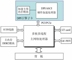 UT斯達(dá)康CCG處理刀片在通用的TC8000業(yè)務(wù)刀片上進(jìn)行了增強(qiáng),DPI采用了增強(qiáng)的64位MIPS64?多核處理器與專業(yè)ASIC芯片相結(jié)合的方案,如圖3所示。由于單純的多核處理器在密集運(yùn)算數(shù)據(jù)處理時(shí)動(dòng)態(tài)功耗會(huì)不斷增加,UT斯達(dá)康CCG解決方案中,DPI處理時(shí)會(huì)將主處理器的一部分負(fù)荷卸載到專用ASIC芯片中,來(lái)降低核心主芯片的功耗,一方面保證了主處理器在較低頻率工作時(shí)大幅降低系統(tǒng)總功耗,另一方面通過(guò)釋放主處理器提升了整個(gè)系統(tǒng)的性能。