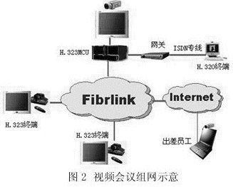 目前視頻會議系統(tǒng)主要有兩大類:一種基于H.320協(xié)議標準,另一種基于H.323協(xié)議標準。H.320會議系統(tǒng)技術(shù)成熟,運行穩(wěn)定,圖像質(zhì)量高,但業(yè)務(wù)功能單一,組網(wǎng)不夠靈活;H.323會議系統(tǒng)是最近兩年興起的視頻會議系統(tǒng),運行在廣泛存在的IP網(wǎng)絡(luò)之上,以功能豐富、組網(wǎng)方便靈活等為主要特征,成為視頻會議系統(tǒng)的發(fā)展方向,但其視頻質(zhì)量很大程度上依賴于所承載的IP網(wǎng)絡(luò)的質(zhì)量。中電飛華公司基于FibrLINK平臺,為用戶提供H.320、H.323以及H.320和H.323混合組網(wǎng)的視頻會議系統(tǒng)建設(shè),如圖2所示。