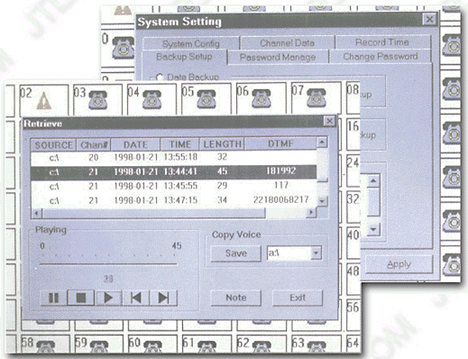 當(dāng)電話打進(jìn)來(lái),系統(tǒng)便自動(dòng)進(jìn)行錄音,系統(tǒng)把語(yǔ)音信號(hào)以數(shù)字化語(yǔ)音格式寫入硬盤。同時(shí)系統(tǒng)記錄其通話日期,摘機(jī)時(shí)間,掛機(jī)時(shí)間和當(dāng)前通話時(shí)間等信息,如果該次電話為打出電話,還可記錄其打出的電話號(hào)碼。掛機(jī)時(shí)系統(tǒng)便會(huì)自動(dòng)停止錄音。 |