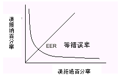 這些錯誤和兩種不同的用戶群有關(guān)。特別是,比如,0.2%的誤接納率,并不意味著0.2%的呼叫者能闖入系統(tǒng),而是0.2%的冒名頂替者企圖闖入。這比例往往只是呼叫者總數(shù)的一個零頭。安全性和方便性須得到折衷平衡。當(dāng)誤接納率接近零時(shí),誤拒絕率則上升,反之亦然。曲線上誤接受和誤拒絕率相等的點(diǎn)叫等錯率(ERR)。
