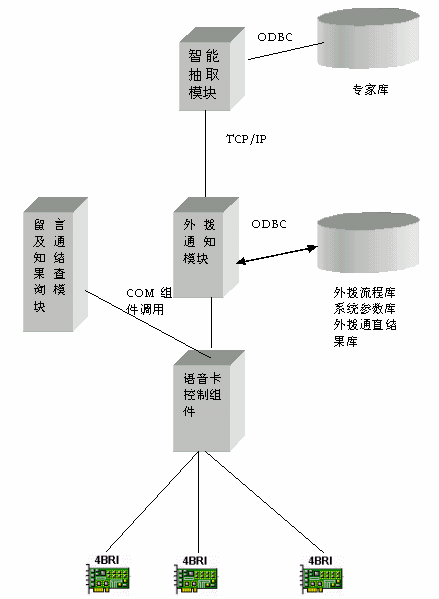 北京市建筑市場專家評(píng)標(biāo)抽取通知系統(tǒng)是靈訊科技有限公司采用加拿大Eicon網(wǎng)絡(luò)公司的Diva Server 4BRI 卡開發(fā)的一套高效的外撥通知系統(tǒng),該系統(tǒng)充分體現(xiàn)了Eicon網(wǎng)絡(luò)公司 Diva Server 4BRI卡強(qiáng)大的語音功能以及系統(tǒng)的穩(wěn)定性,準(zhǔn)確地識(shí)別了外撥手機(jī)的遇忙、無人、不再服務(wù)區(qū)、關(guān)機(jī)、空號(hào)等狀態(tài),實(shí)現(xiàn)了對(duì)手機(jī)狀態(tài)的全面監(jiān)控,全面解決了模擬語音卡對(duì)外撥手機(jī)信號(hào)無法判斷的問題。具體的系統(tǒng)架構(gòu)如下:![]()