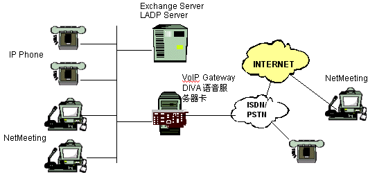 電話呼叫。在這種情況下,多于一個(gè)的電話連接可以同時(shí)在IP線路上通過數(shù)據(jù)包來傳送。通過使用G.723.1將語音進(jìn)行壓縮,傳送一路話音所需的帶寬將從64kbps(ISDN線路)減少到5.3kbps.如果在廣域連接中沒有足夠的帶寬或者廣域連接因?yàn)槟承┮蛟袛啵覀內(nèi)匀贿可以使用原來的PSTN來呼叫遠(yuǎn)端的辦公室。這就意味著用戶可以使用原來的服務(wù)方式而不僅僅只依賴于IP連接。所以,DIVA語音服務(wù)器的實(shí)施將通過提供附加的,低費(fèi)用的電話呼
