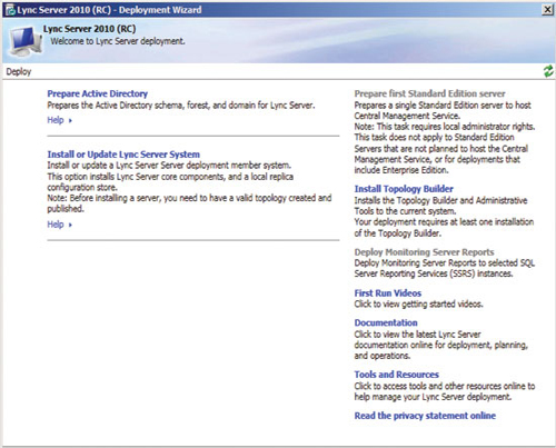 準備好基礎結(jié)構(gòu)并發(fā)布拓撲后,即可開始安裝前端服務器和服務器角色,以啟用 A/V 會議、企業(yè)語音、監(jiān)控、存檔及其他功能。準備每臺服務器從運行部署向?qū)В▍⒁妶D 3)開始,但每個服務器角色都有自己的安裝和配置要求。您可以在 TechNet 庫的“部署 Lync Server 2010 Standard Edition”部分查找更多詳細信息。