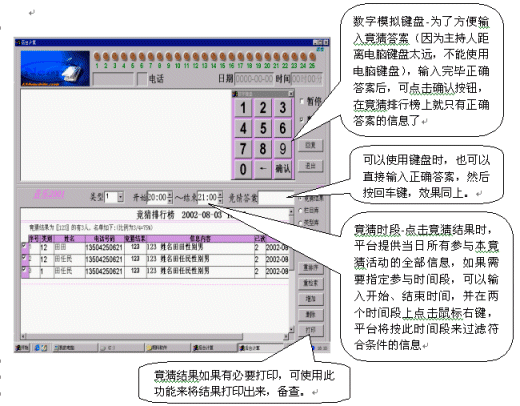 竟猜前必須對聽眾廣播,為了竟猜的準確性,希望發(fā)送信息時,必須把竟猜結果發(fā)送在前面, 如(12345姓名李立),否則,系統(tǒng)將不能識別其答案。竟猜結束時,只要點擊竟猜結果選項,系統(tǒng)會自動將所有參與本節(jié)目的竟猜結果統(tǒng)計出來(此時沒有限制時間段),如果需要限制時間段,則應在"開始"、"結束"時間段中輸入開始和結束的時間,并在其中任何一個時間段上點擊鼠標右鍵,系統(tǒng)將會自動過濾出符合條件的信息。