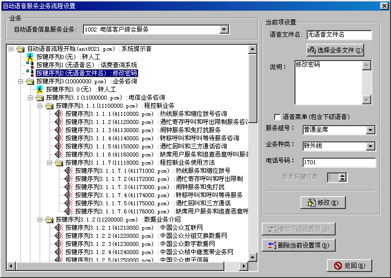 。。編制成功的業(yè)務(wù)流程由業(yè)務(wù)處理點(diǎn)在線加載執(zhí)行,保證系統(tǒng)功能的動態(tài)擴(kuò)充。可在線加載自動業(yè)務(wù),多種自動業(yè)務(wù)在動態(tài)加載時(shí),為不影響正在處理的呼叫,可多版本運(yùn)行,舊版本業(yè)務(wù)的呼叫處理全部結(jié)束后,舊版本業(yè)務(wù)自動升級。
