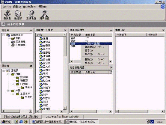 北京優(yōu)創(chuàng)信通科技公司基于完全自主版權(quán)的 SmartMessage Pro架構(gòu),將 Windows OutLook有機(jī)擴(kuò)展,是集CTI、TTS、CMPP、SMTP/POP3技術(shù)的統(tǒng)一消息轉(zhuǎn)換和發(fā)布一體化解決的產(chǎn)品,可以支持Intranet內(nèi)部網(wǎng)的電話語音/傳真、手機(jī)短信和Email消息的大量分發(fā)。