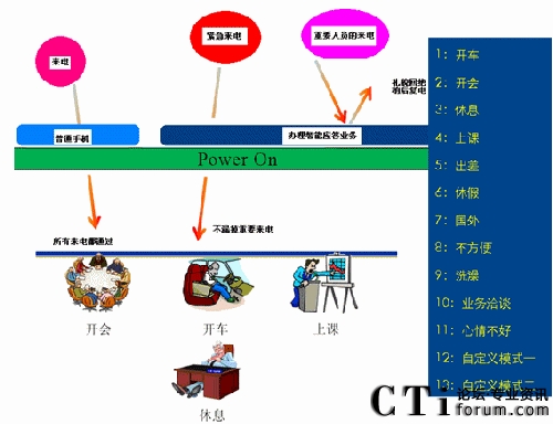 智能應(yīng)答業(yè)務(wù)是針對消費者不便通話時的一個增值業(yè)務(wù)。當(dāng)被叫用戶有來電時,因為自己的原因不便通話而掛斷電話后通過手機彈出的菜單,供用戶選擇與對方進行的后續(xù)溝通。被叫用戶可以根據(jù)所處的情況選擇對應(yīng)的情景,系統(tǒng)將根據(jù)用戶選擇的情景對應(yīng)給主叫用戶發(fā)送短信和放音。智能應(yīng)答業(yè)務(wù)給了我們禮貌拒接的機會。當(dāng)您正在會議室里和客戶如火如荼的策劃下個項目,當(dāng)然不想被其他人打擾。突然有個電話打了進來,接還是不接,不接有可能是一個潛在的客戶,接了又是對目前工作的一種打斷。如果你辦理了智能應(yīng)答業(yè)務(wù),當(dāng)你掛斷電話的同時手機上將出現(xiàn)一個菜單,你可以根據(jù)當(dāng)前具體情況選擇目前所處的情景(開車、開會、上課……等)。如你選擇了某種情景,系統(tǒng)將根據(jù)用戶選擇的情景,給主叫用戶播放相應(yīng)的語音通知(如:“您撥叫的用戶正在開會,請稍后再撥”)。
